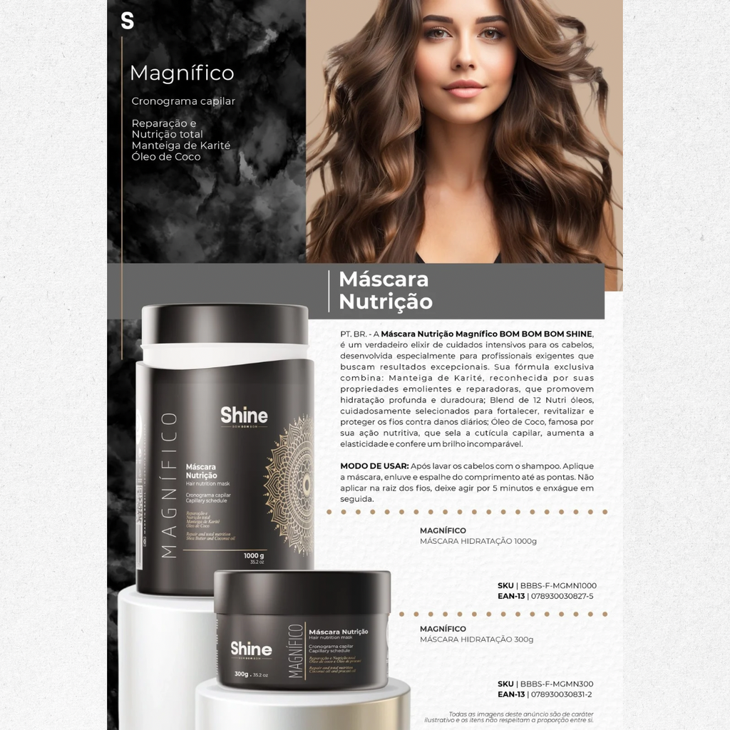 A Máscara Nutrição Magnífico BOM BOM BOM SHINE, é um verdadeiro elixir de cuidados intensivos para os cabelos, desenvolvida especialmente para profissionais exigentes que buscam resultados excepcionais. Sua fórmula exclusiva combina: Manteiga de Karité, reconhecida por suas propriedades emolientes e reparadoras, que promovem hidratação profunda e duradoura; Blend de 12 Nutri óleos, cuidadosamente selecionados para fortalecer, revitalizar e proteger os fios contra danos diários; Óleo de Coco, famosa por sua ação nutritiva, que sela a cutícula capilar, aumenta a elasticidade e confere um brilho incomparável.